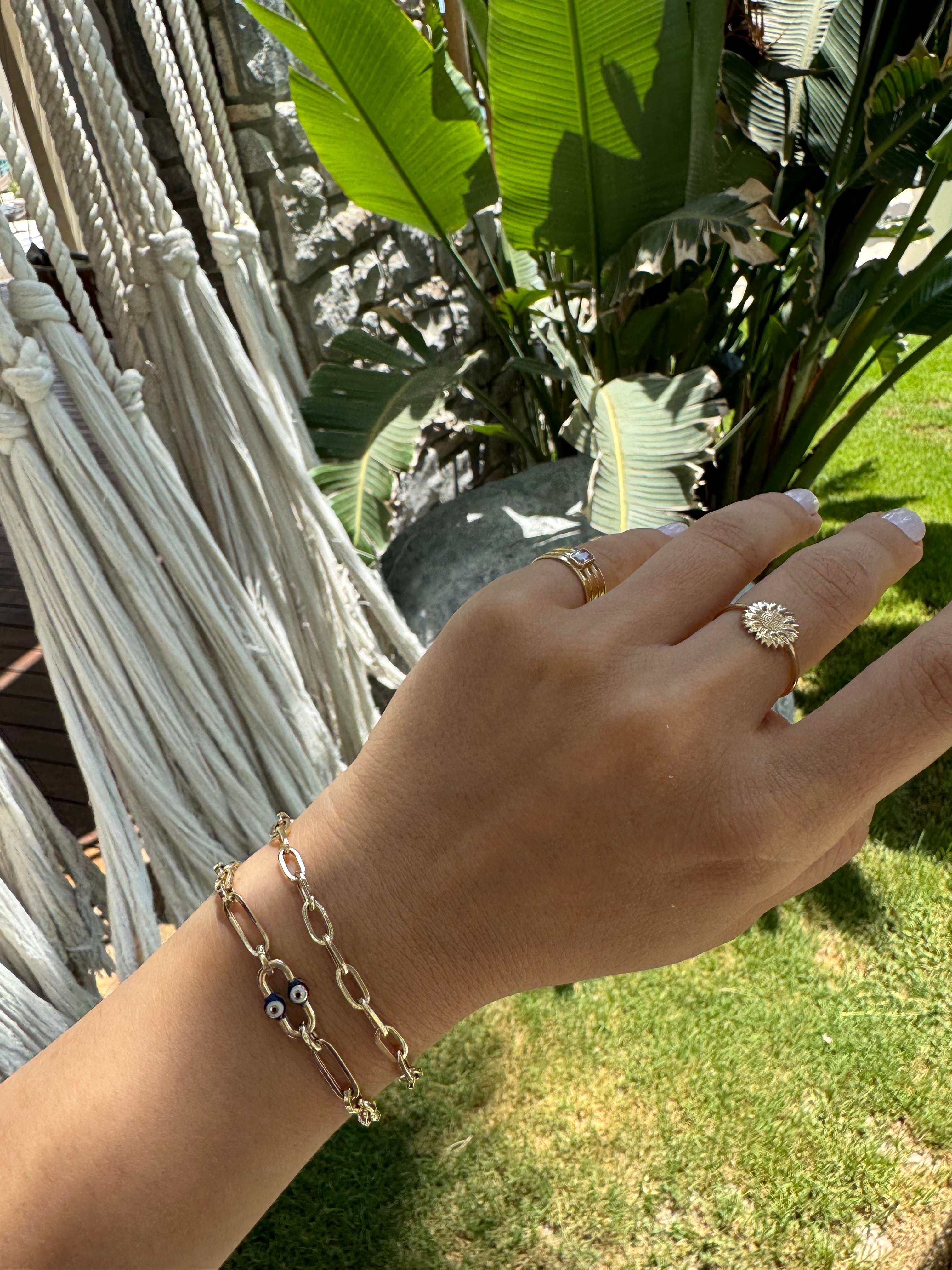 Göz figürünün gizemli ve büyüleyici atmosferi, bu bilekliği diğerlerinden ayırır. Her bir gözün detaylı işlemesi, zarafet ve özgünlük arayanların tercihi olurken, ataç detayı bileğinizde cesur bir ifade sunar. Bu bileklik, bakışları üzerinize çeker ve stilinizi mükemmel bir şekilde tamamlar.