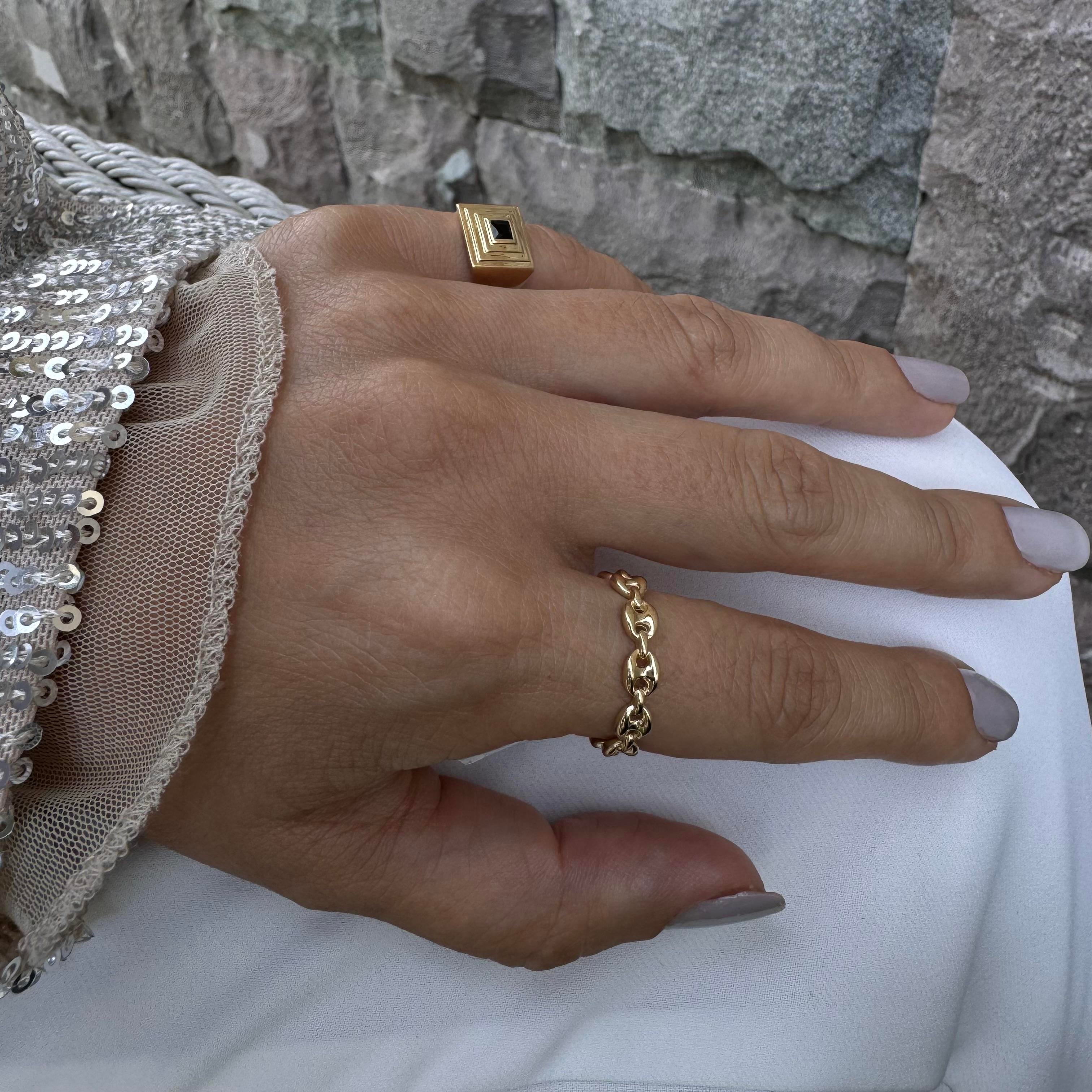 Bu yüzük, sahibine mistik bir aura katıyor. Siyah taşın derinliği, üzerindeki işlemelerle birleştiğinde, adeta büyüleyici bir hikaye anlatır gibi. İris deseni, tanrısal mesajları ileten bir sembol olarak bilinir ve yüzüğe ayrı bir anlam katar. İşlenmiş olduğu siyah taş üzerinde, İris deseni, yüzüğün taşıdığı enerjiyi katlayarak arttırır.