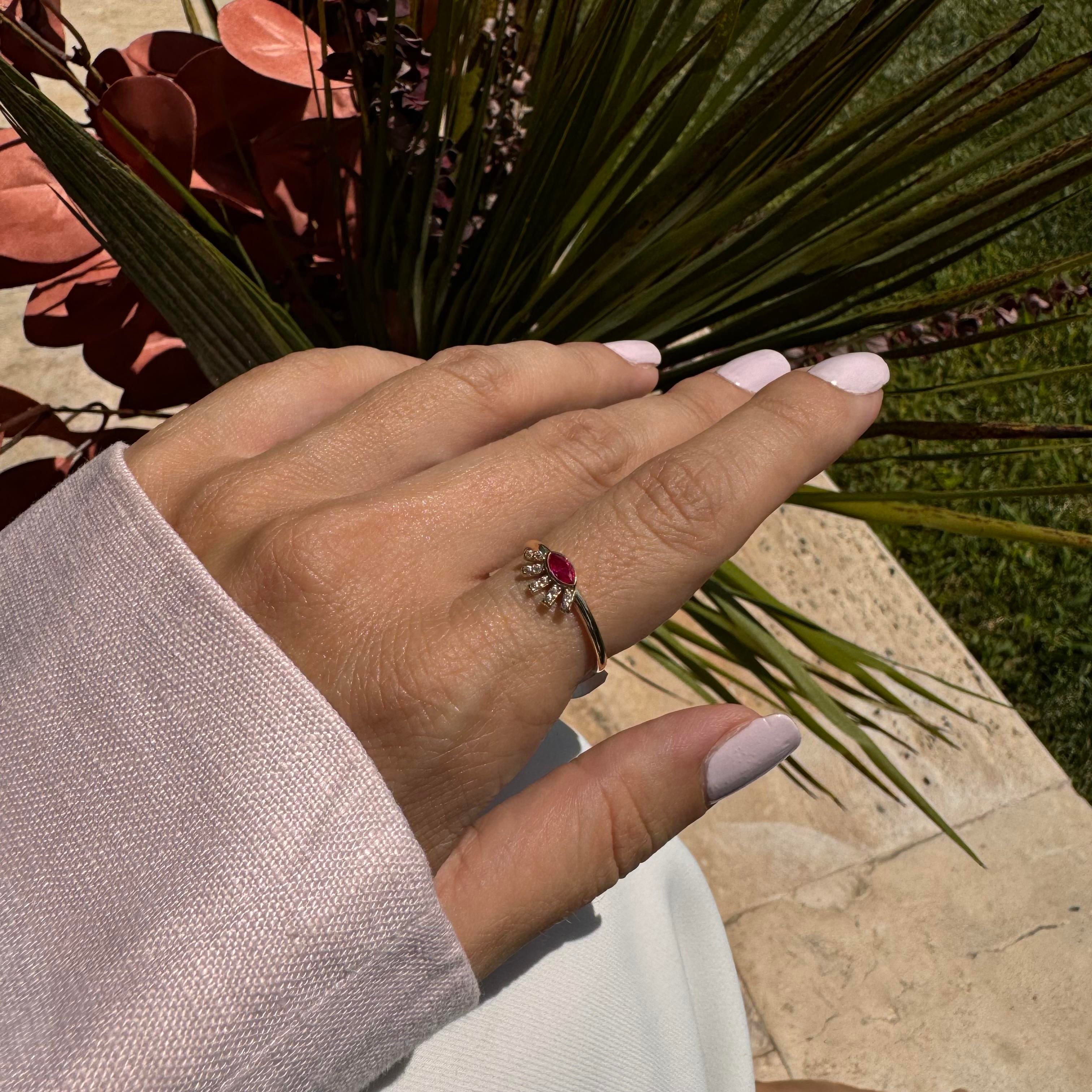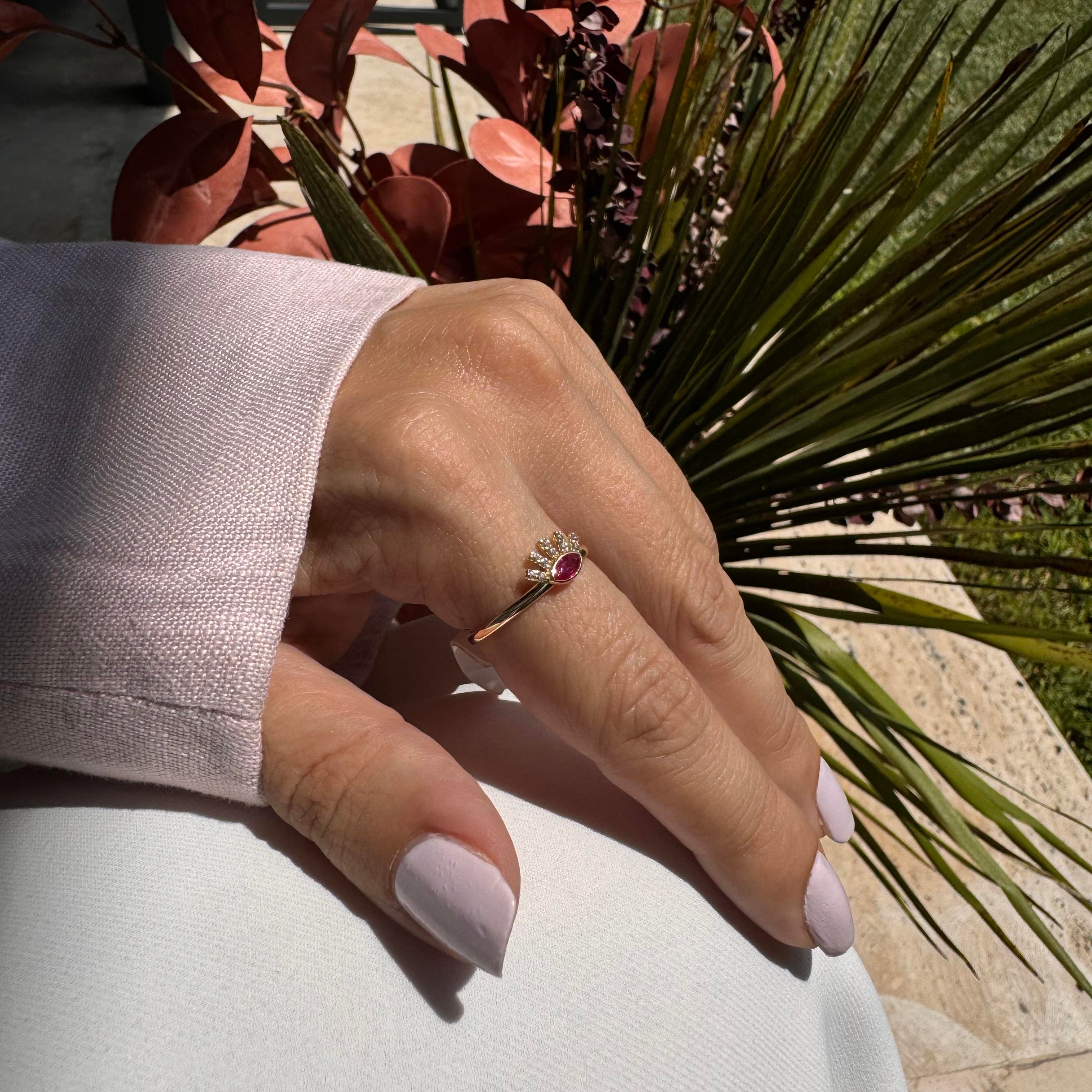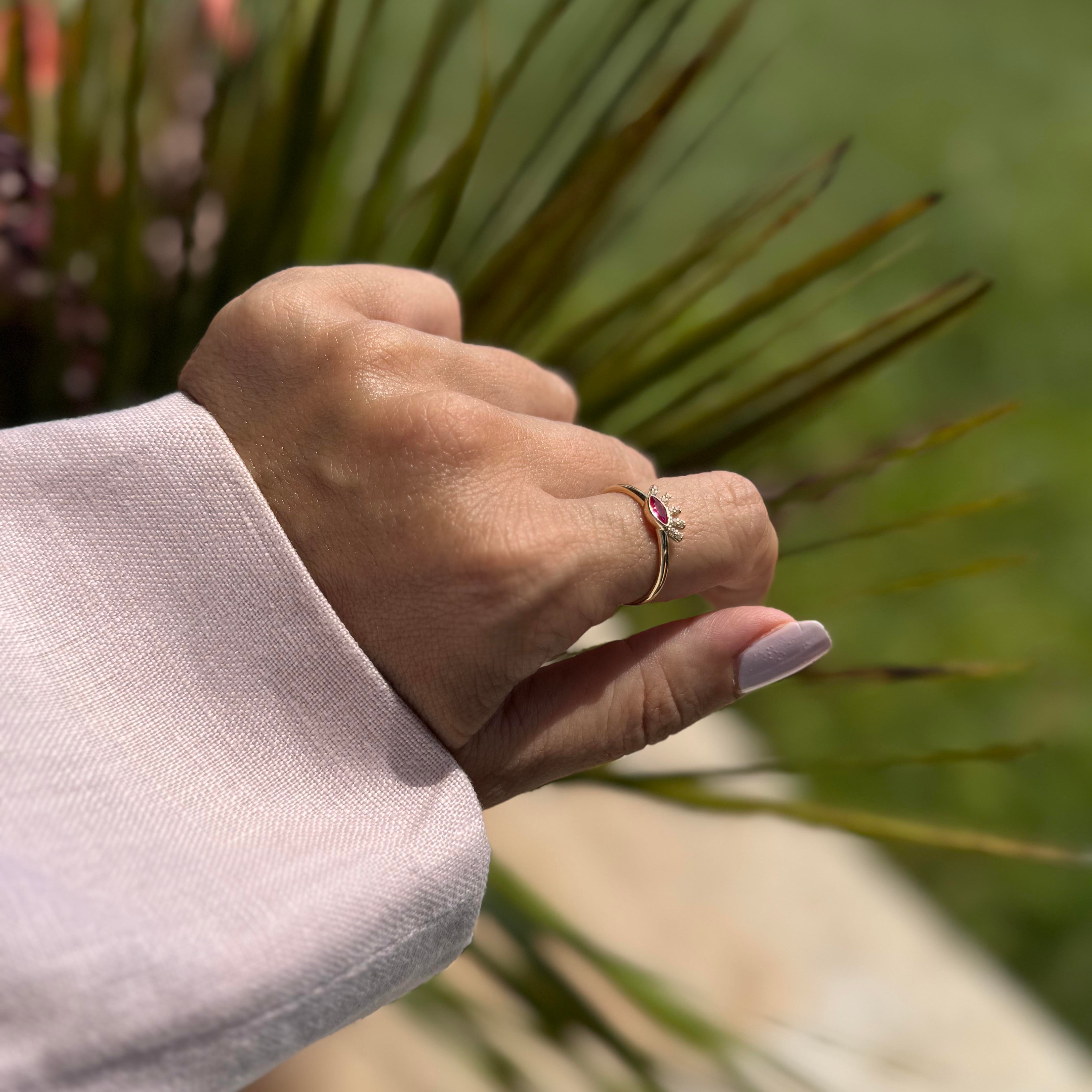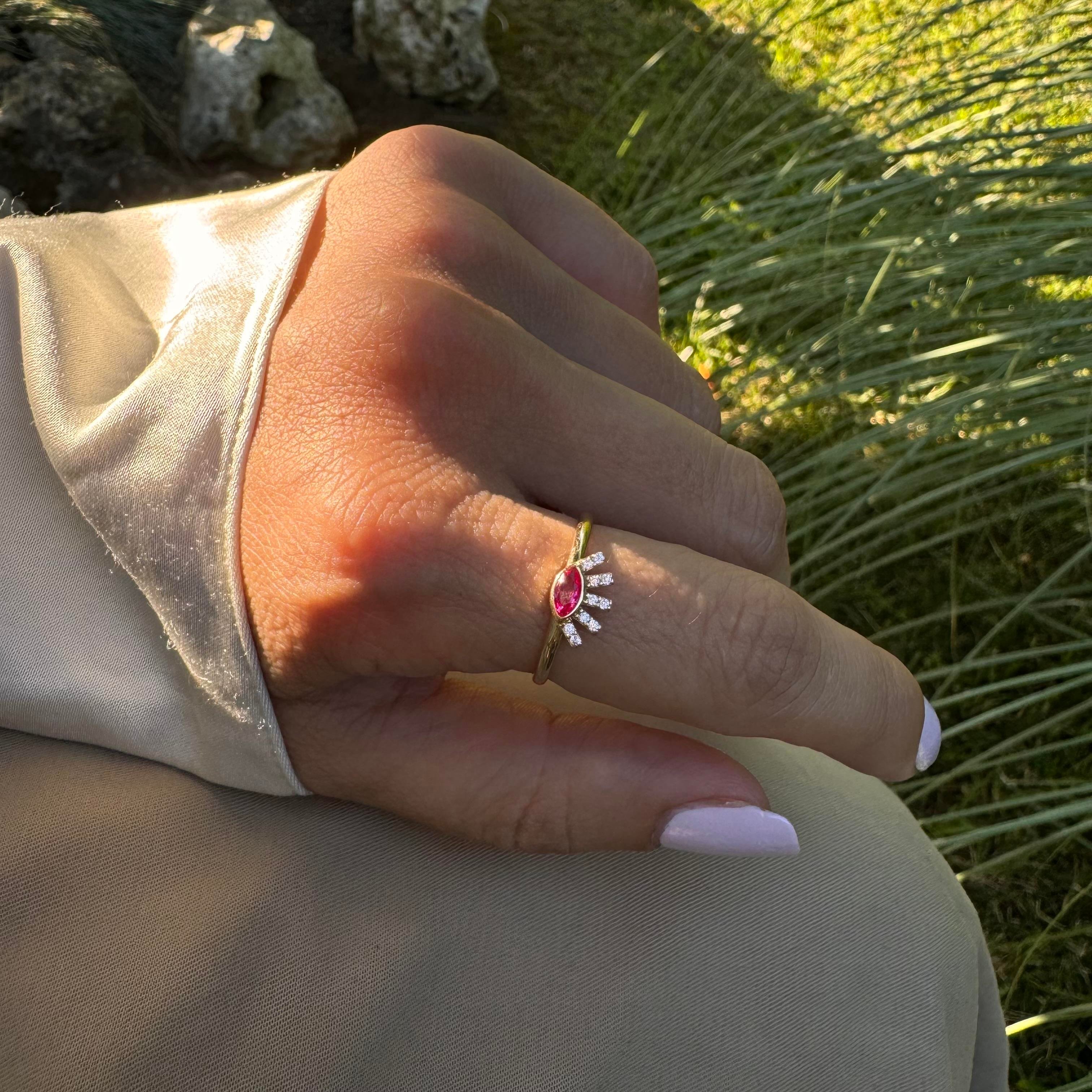 Her bir taşın özenle seçilmiş olması, yüzüğe derinlik ve zenginlik katar. Fuşya renginin enerjisi, taşıyan kişiye neşe ve canlılık getirirken, taşların parıltısı ise göz kamaştırıcı bir güzellik sunar. Bu mücevher, sadece dış güzellik değil, aynı zamanda içsel bir güç ve özgüven kaynağıdır.