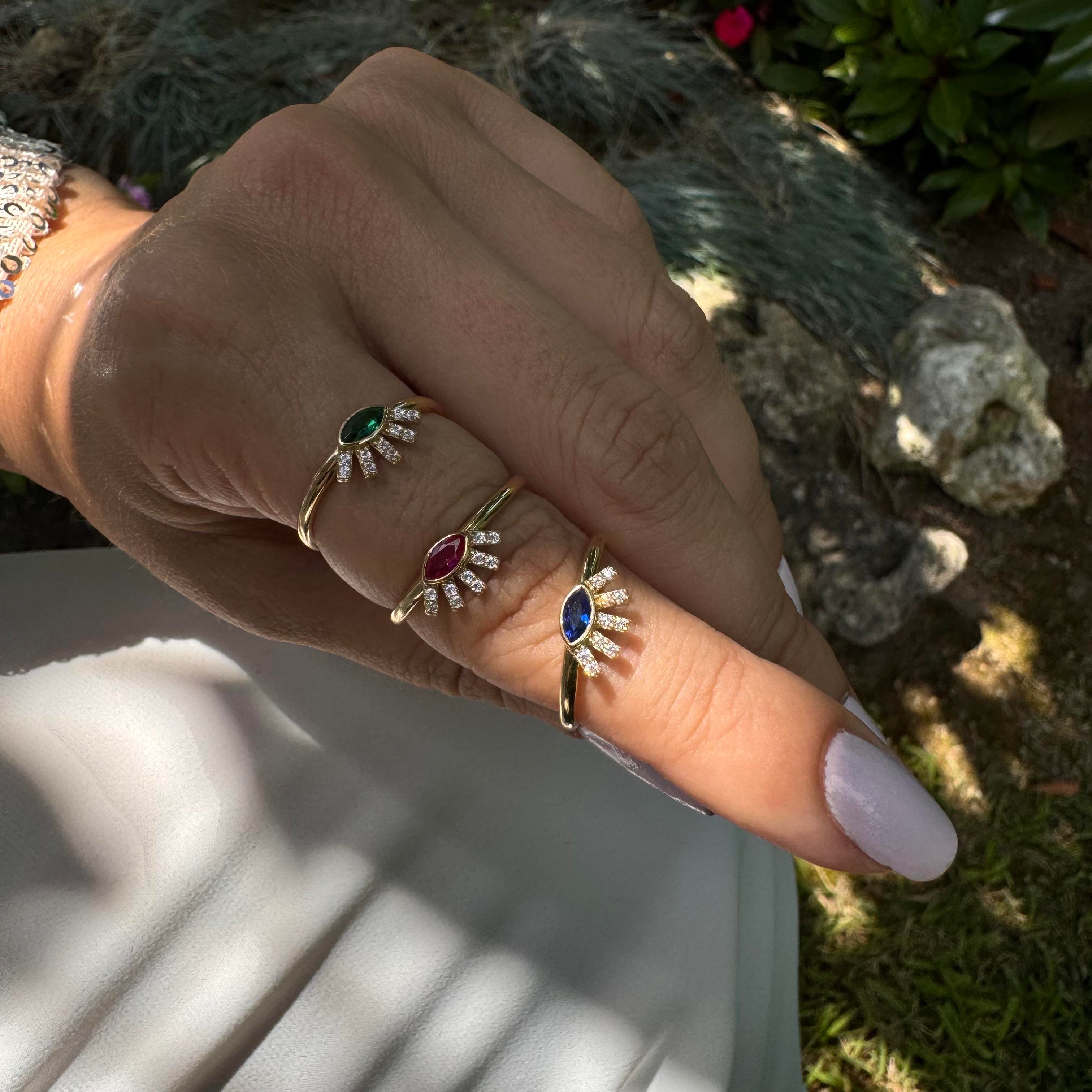 Bu yüzük, sadece bir mücevher değil, aynı zamanda bir ifade biçimidir. Mavinin asaleti ve taşların parıltısı, sahibine güç ve zenginlik hissi verir. Yüzüğün tasarımındaki incelikler ise sahibine zarafet ve asalet katarken, onu özel kılar. Her bir detay özenle seçilmiş, her bir taş ustalıkla işlenmiştir.