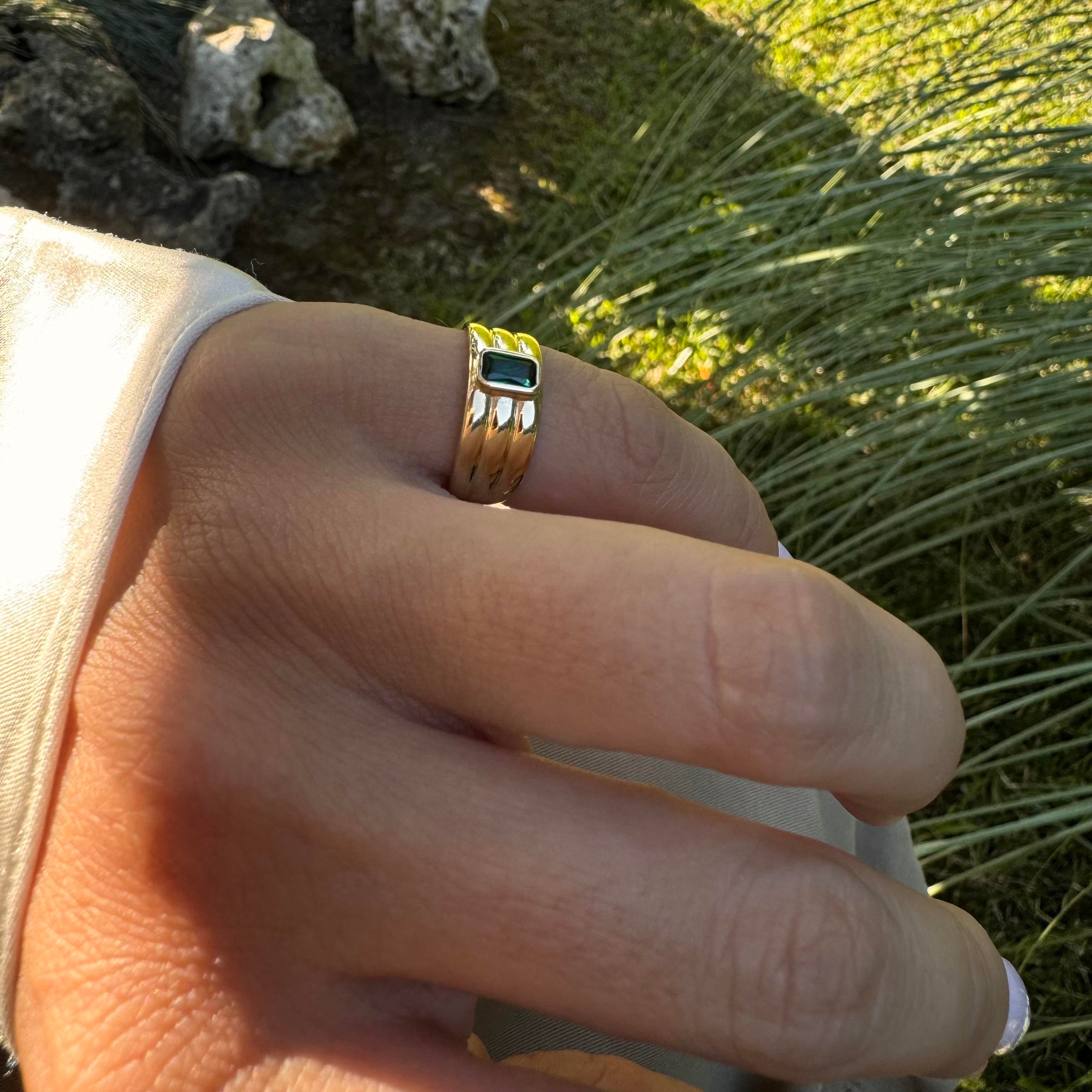 Zümrüt taşlarının derin yeşili, doğanın büyüsünü ve yaşamın gücünü yansıtır. Her bir taş, ışıltısıyla dikkat çekerken, yüzüğün tasarımındaki incelik ve zarafet, bir kraliçenin asaletini ve gücünü temsil eder. Her bir çizgi, her bir detay, kraliyetin estetik ve zerafetini yansıtarak, yüzüğün her bakışta göz kamaştıran bir güzellik sergilediğini görebilirsiniz.