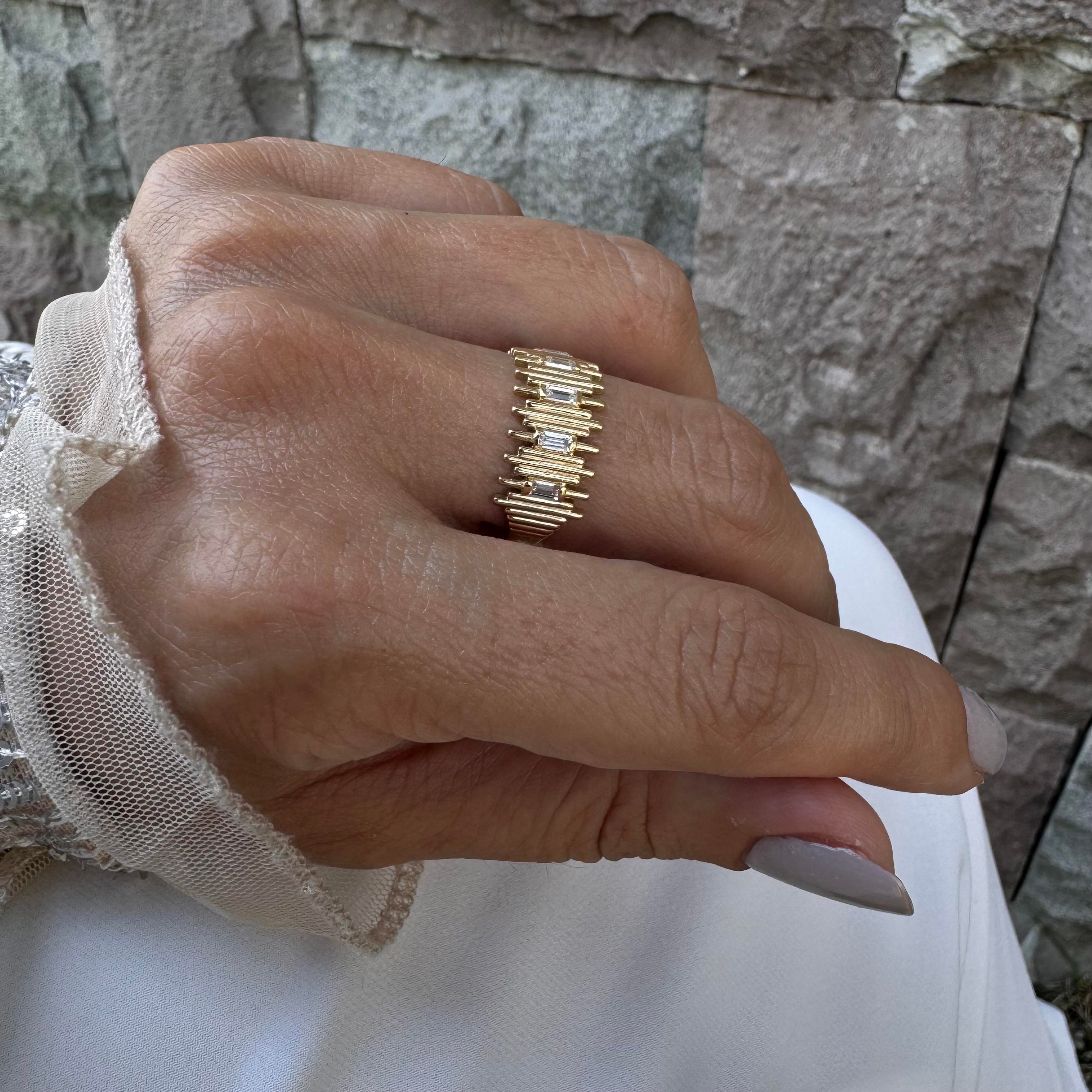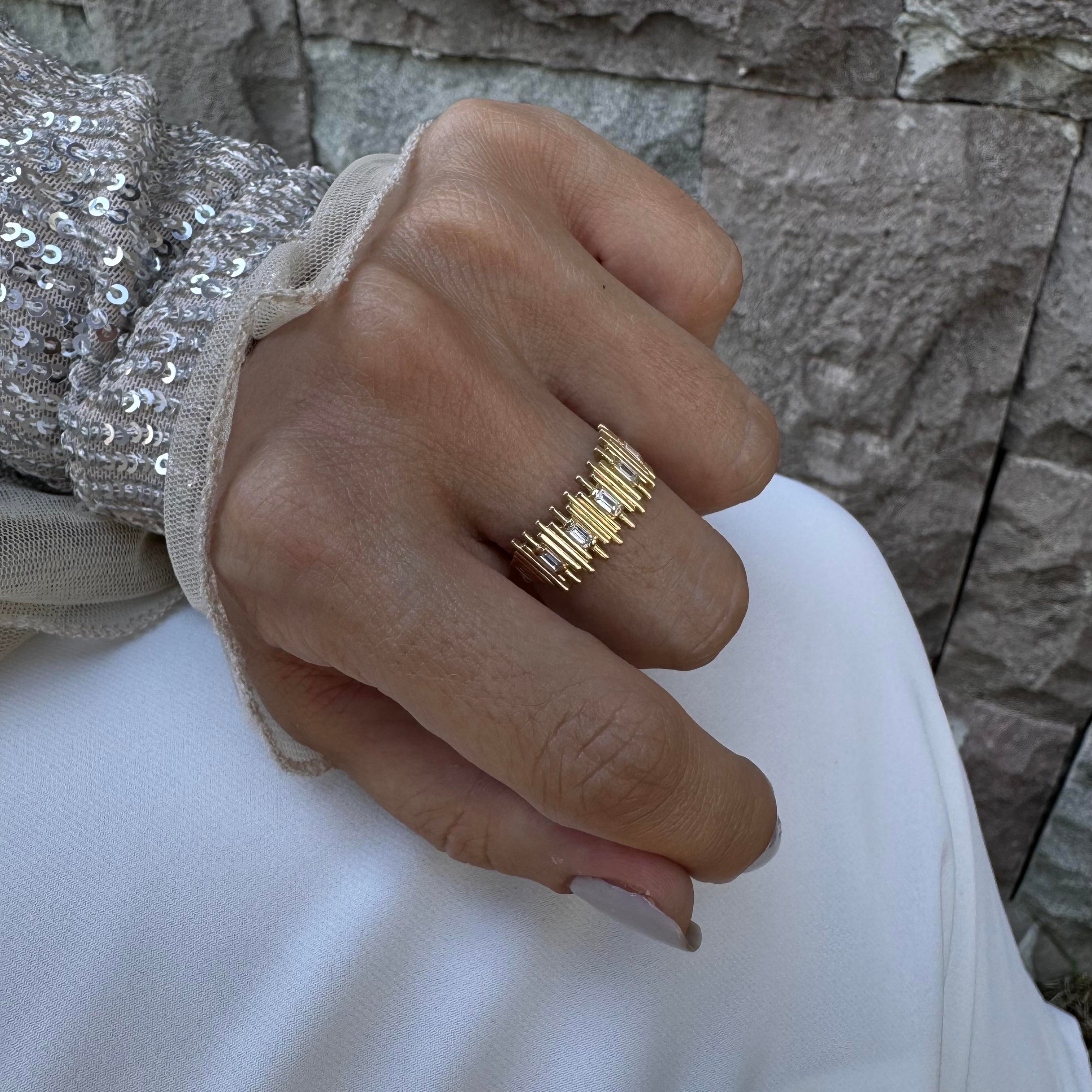Bu yüzük, sadece bir mücevher değil, aynı zamanda bir ifade biçimidir. Hareket ve ritmi taşıyan bu yüzük, sahibine yaşamın dinamizmini ve heyecanını hatırlatırken, aynı zamanda ona özel bir tarz ve benzersizlik kazandırır. Her bir detay özenle seçilmiş, her bir işçilik ustalıkla işlenmiştir.