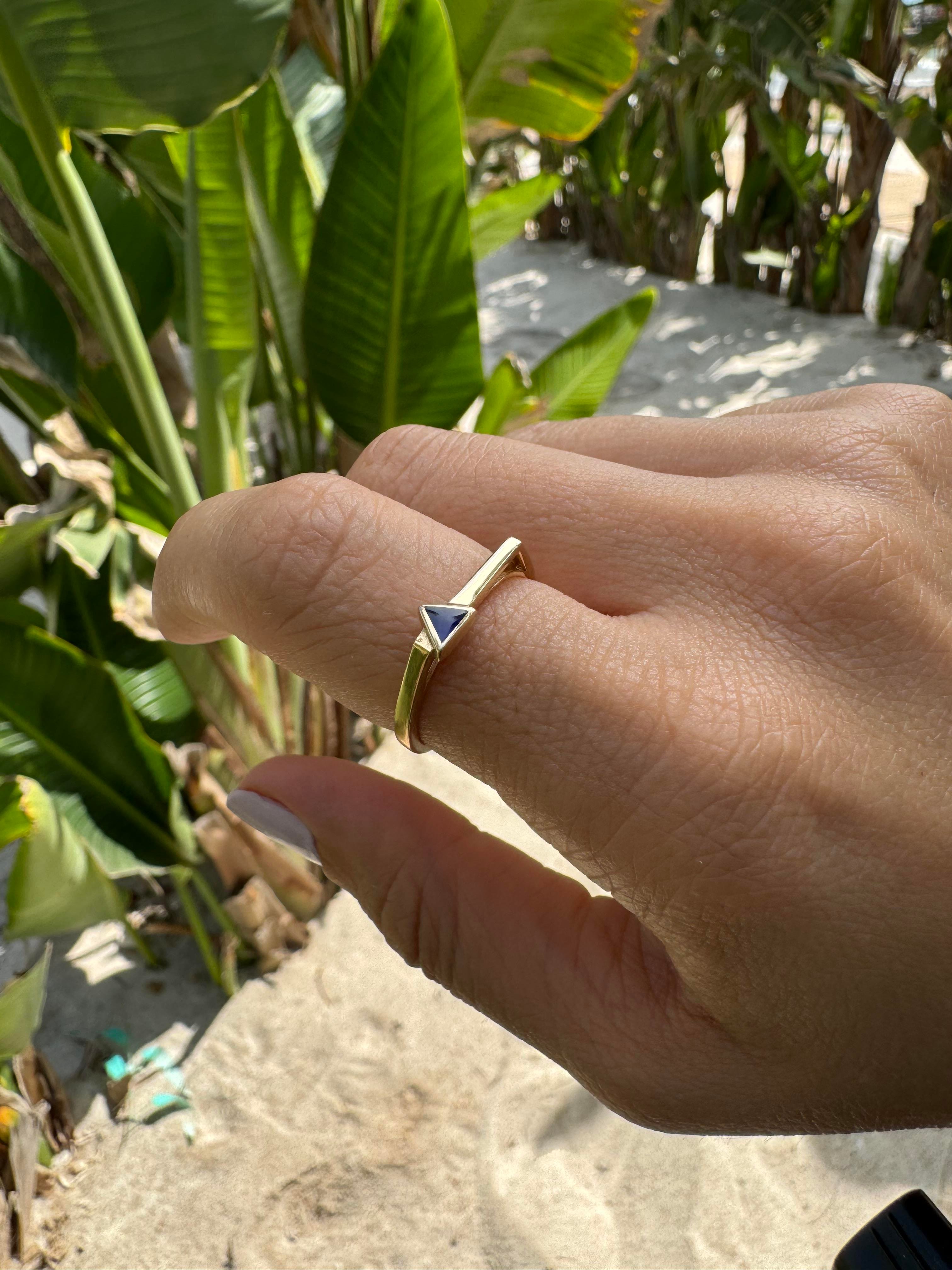 , minimalizmin zarafetle buluştuğu, şıklığın en özgün halini temsil eden bir mücevherdir. Adını üçgen şeklinin zarif tasarımından ve küçük boyutundan alan bu yüzük, taşıyan kişiye sade ve şık bir tarzın en güzel ifadesini sunar.