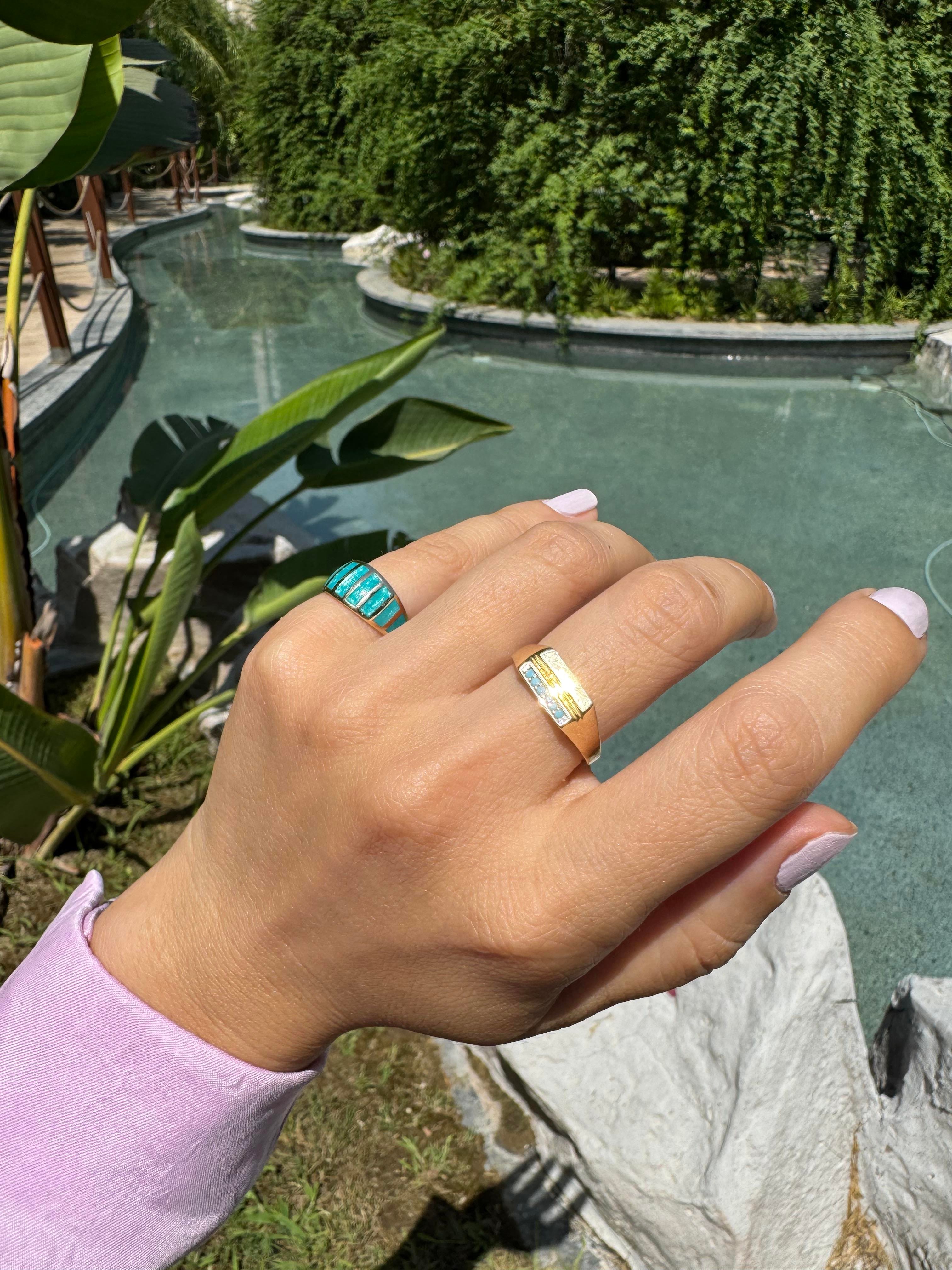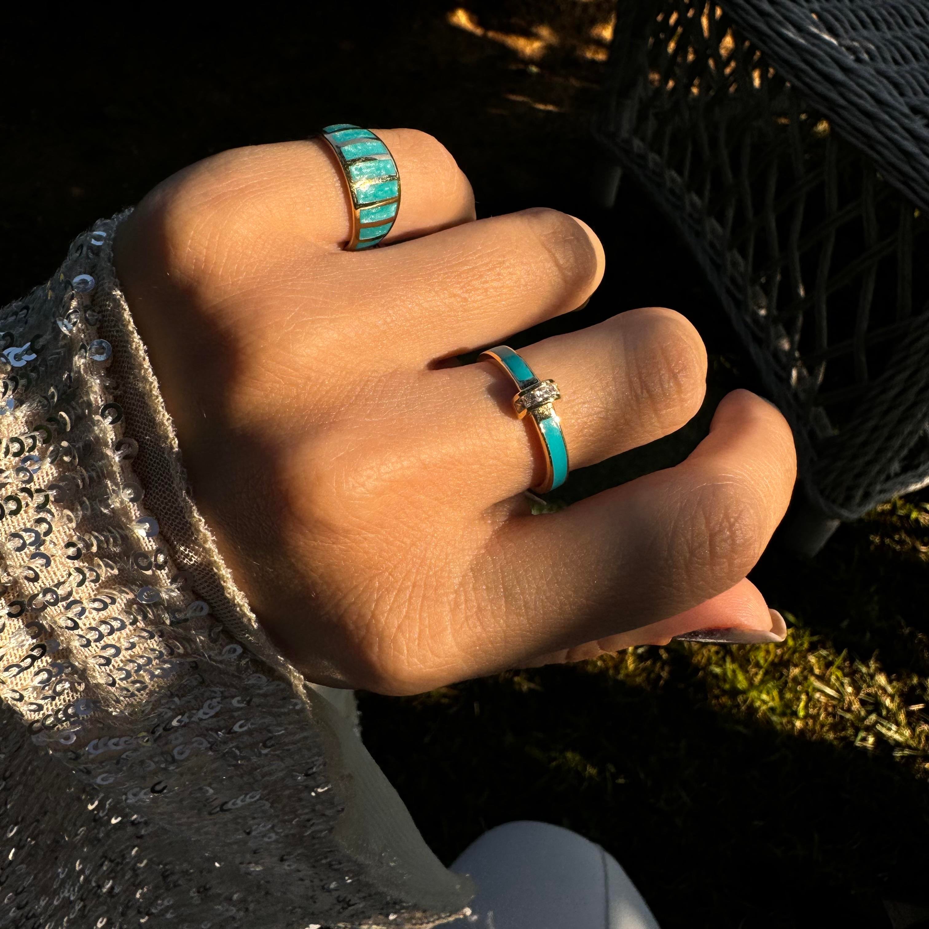 Vintage tarzın getirdiği nostalji, yüzüğe ayrı bir değer ve anlam katarken, turkuaz minenin taşıdığı mistik aura, sahibine derin bir dinginlik ve huzur hissi veriyor. Her bakışta geçmişin romantizmiyle buluşurken, her dokunuşta günümüzün şıklığıyla harmanlanmış bir parçaya sahip olduğunuzu hissedersiniz.