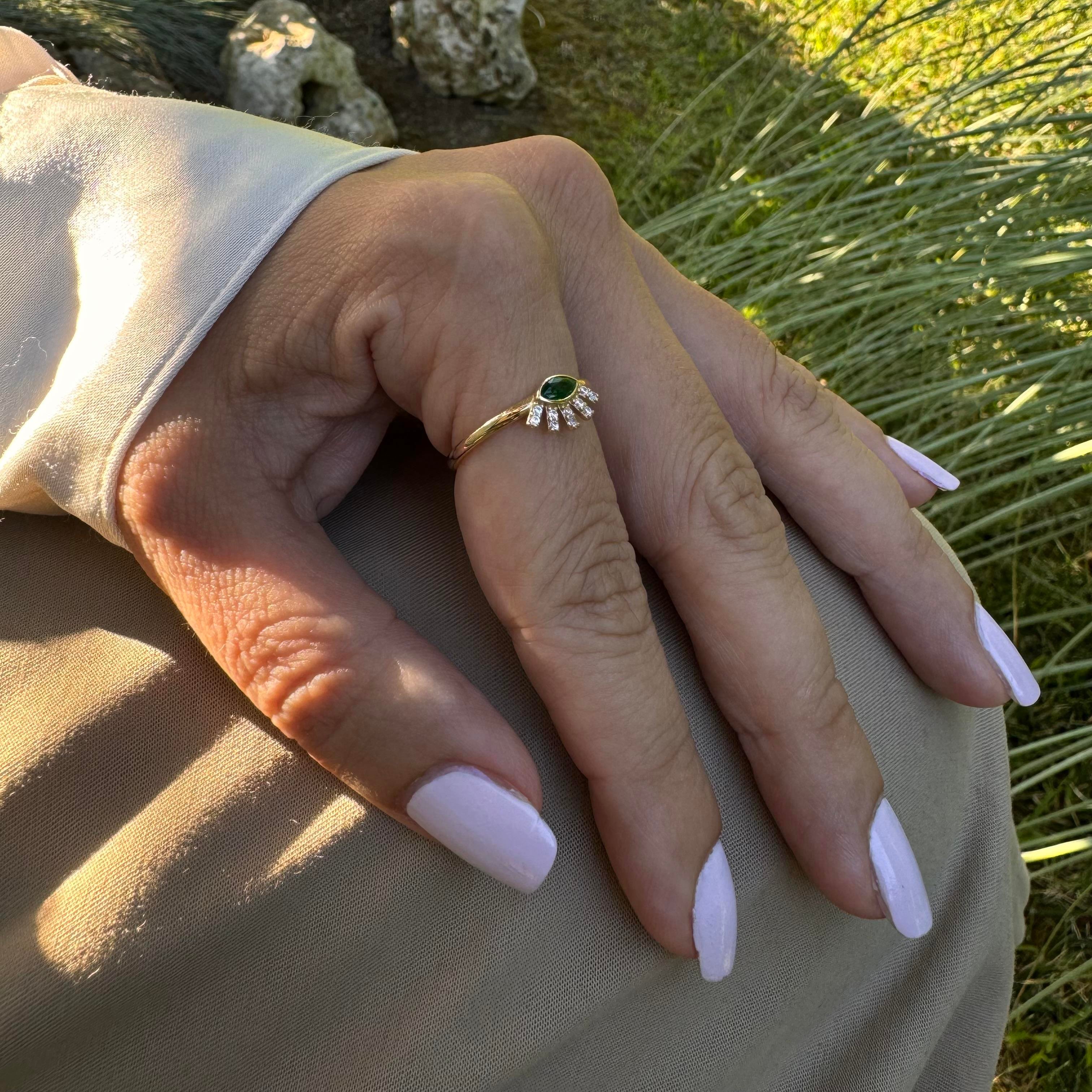 Elizabeth döneminin etkileyici zarafetini çağrıştıran bu yüzük, Zümrüt taşlarının canlı yeşiliyle dikkat çeker. Bu değerli taşlar, doğanın gücünü ve zenginliğini simgelerken, yüzüğün tasarımındaki detaylar ise asalet ve ihtişamı yansıtır.