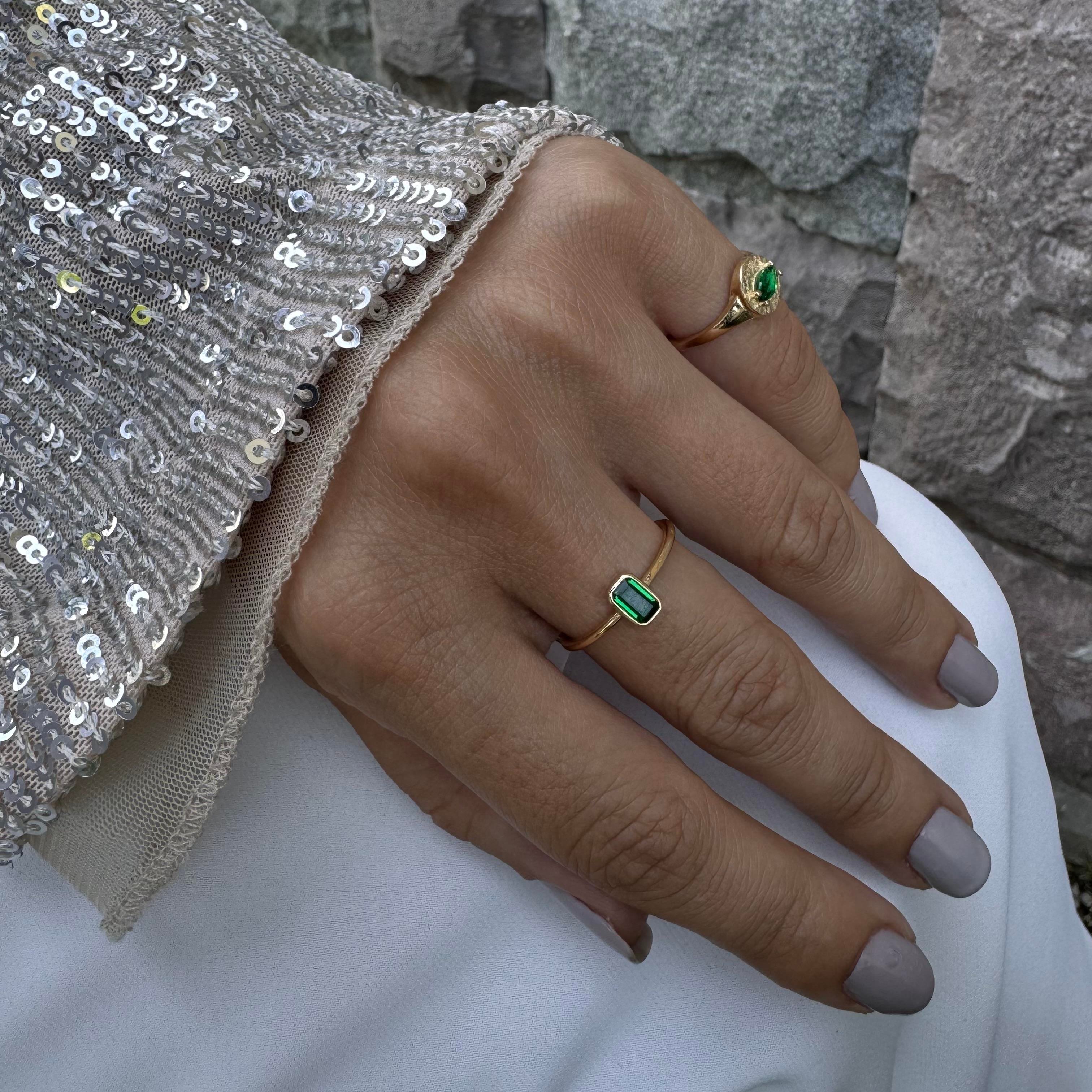 Bu yüzük, sadece bir mücevher değil, aynı zamanda bir ifade biçimidir. Zümrüt taşının eşsiz güzelliğini ve lüksünü taşıyan bu yüzük, sahibine içsel bir huzur ve mutluluk verirken, aynı zamanda ona özel bir tarz ve benzersizlik kazandırır. Her bir detay özenle seçilmiş, her bir işçilik ustalıkla işlenmiştir.